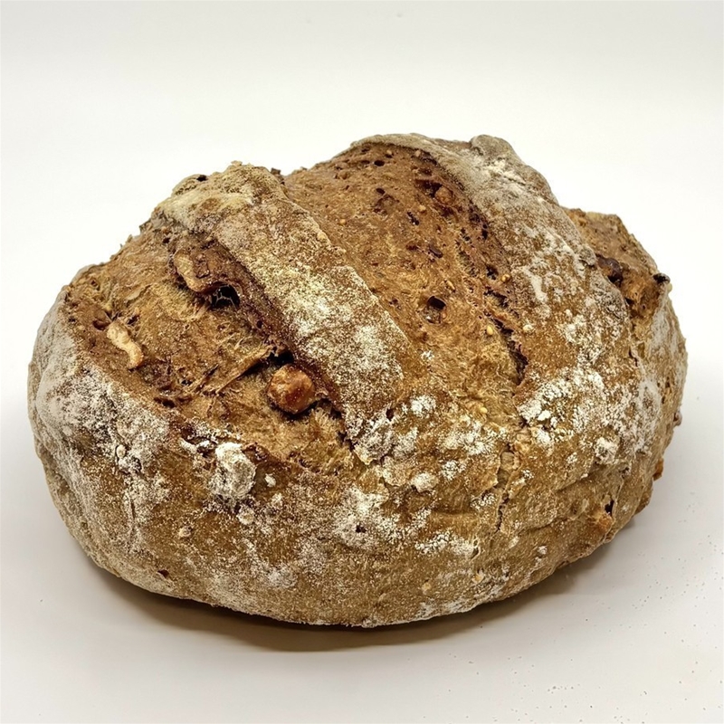 Dit desembrood is gebakken in onze steenoven en heeft daardoor een heerlijke krokante korst. Een volkoren brood gemaakt van tarwemeel en gevuld met hazelnoten en walnoten. Gemaakt met onze eigen zuurdesem starter.