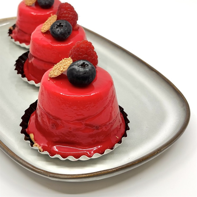 Een bavaroise gebakje met yoghurt, bosvruchten en blauwe bessen.