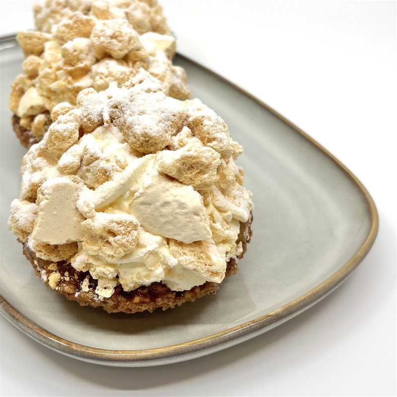 Een schelpje gevuld met kersen, slagroom en meringue schuim.