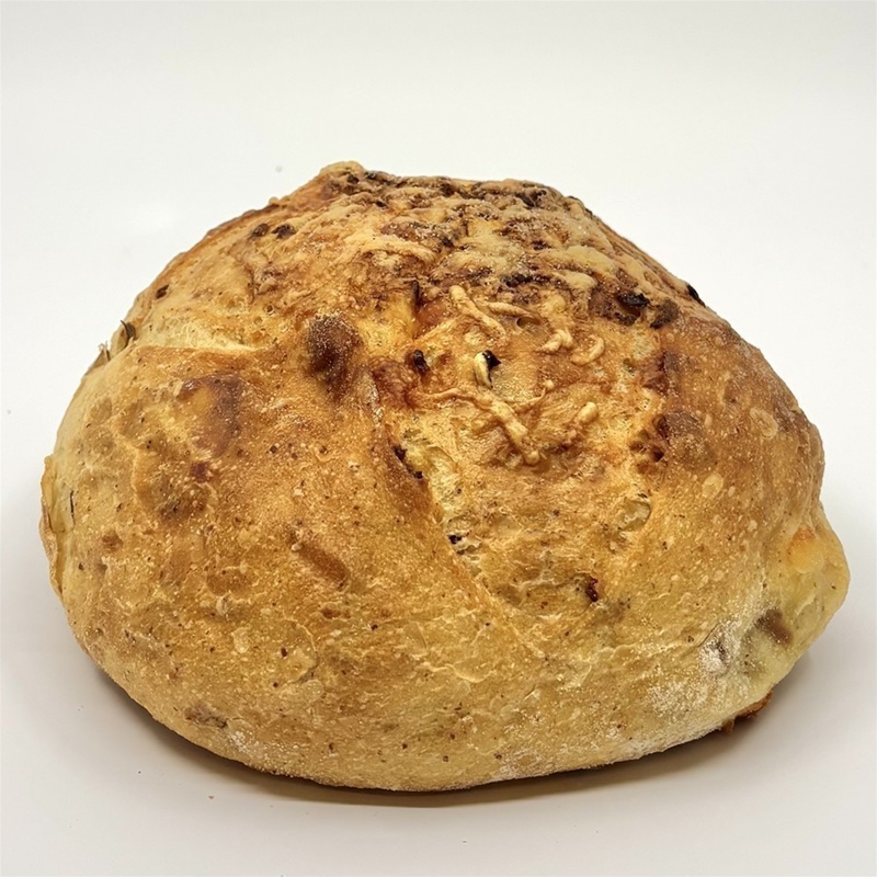 Een witte desem gemaakt van tarwebloem en gevuld met mosterd, oude kaas en een gebakken uitje. Gemaakt met onze eigen zuurdesem starter.