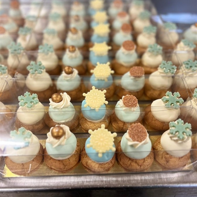 Per 5 stuks verpakt in een doosje. Een perfect mini gebakje voor bij de koffie. Een bitterkoekje met creme, afgewerkt met chocolade in seizoens/thema kleuren.
